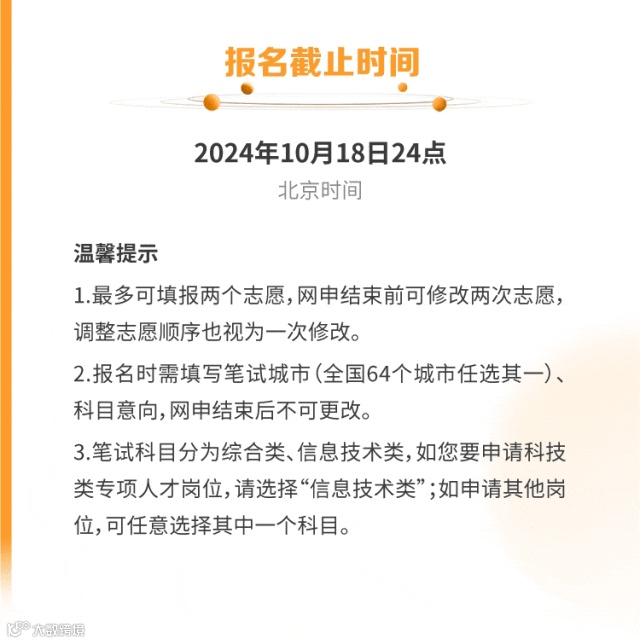 报名时间:2024年9月20日至2024年10月31日24:00网申地址:cnooc.zhaopin.com资格审查报名结束后,中国海油按照应聘基本要求以及招聘岗位中的具体条件对应聘毕业生进行资格审核,确定参加统一考试的应聘毕业生名单。统一考试