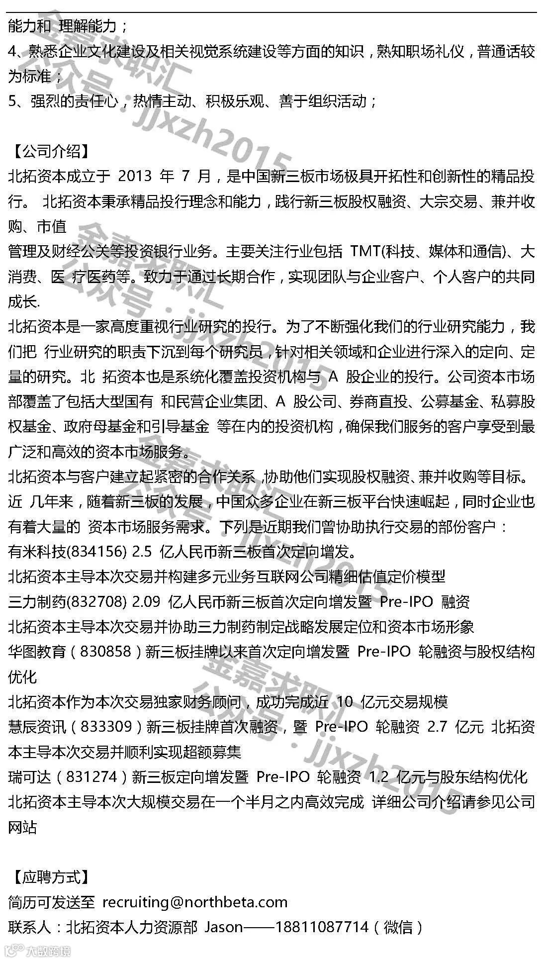 2、 1年以上券商投行相关行业工作经验或1年以上四大会计师事务所工作经验优先;