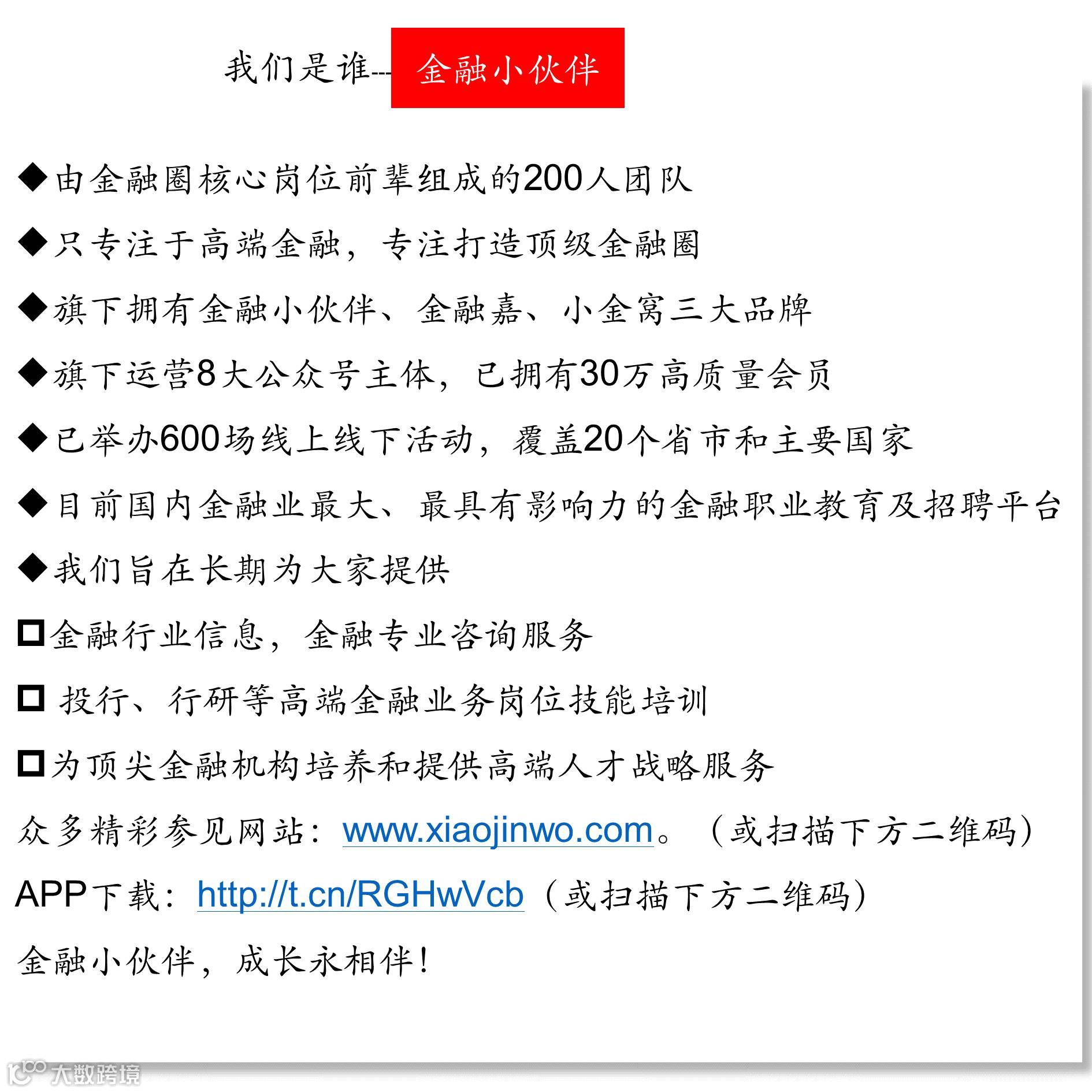 金融小伙伴致力于搭建一个金融垂直领域职业信息分享和交流公益平台,通过持续不断的公众号推文和线上线下活动,提供及时、全面、高效的行业招聘信息和职场提升经验。目前,我们已吸引了超过100万粉丝,在海内外金融学子和在职人士中均享有盛誉。