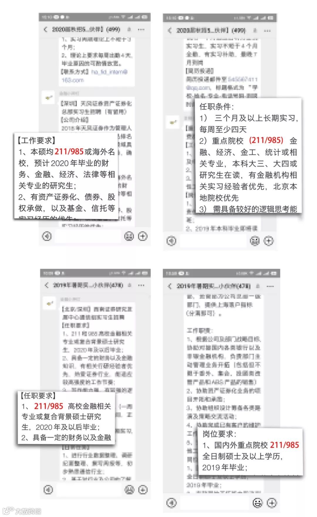这种言论也不是空穴来风,看看各家的招聘简章中的任职要求,明确规定本科要求211、985院校毕业生,这还只是实习生的录用标准,备受年轻才俊追捧的金融行业为何如此讲究学历?