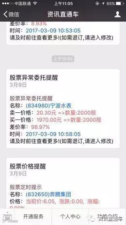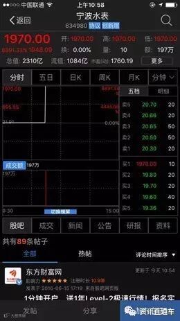 上午10:58分05秒, 资讯直通车股票异常委托提醒功能突然显示一笔异常挂单,有人以1970.00元的价格,买入2000股宁波水表(834980)的委托出现在股票行情界面上。