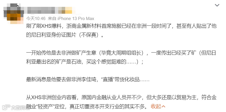 这个消息在金融圈沸沸扬扬的传播了好几天,八妹也去进行了多方探查,有消息说“一开始传他是去非洲做矿产生意(毕竟大周期组组长),一度传出已经买了矿”……