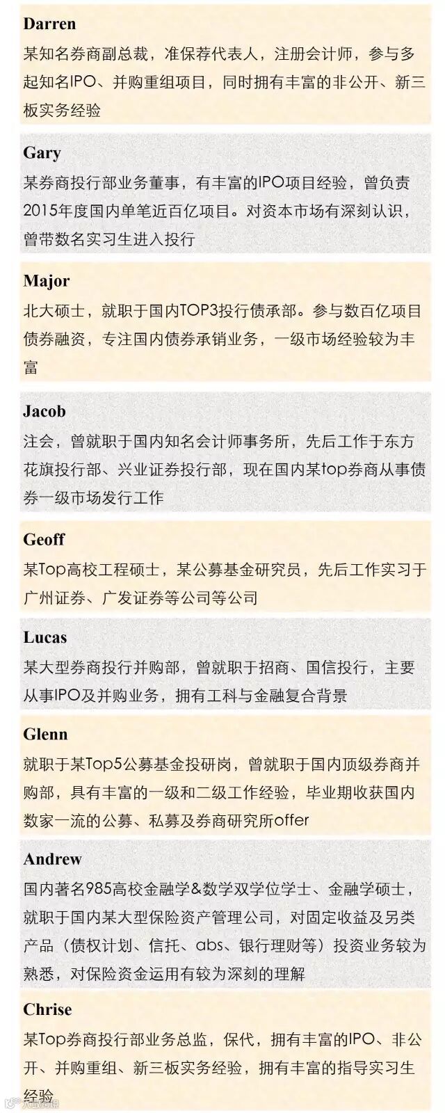 2016年末,首期精英学徒计划从超过400名候选人中选出了17名学员,以师徒相授的形式,为学员搭建金融实务知识框架体系、培养投行与行研核心技能、提升写作能力、传授求职和一线业务经验。