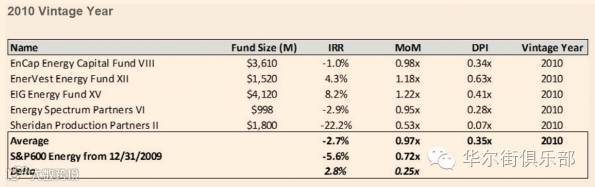 2010年MoM均值为0.97X,DPI均值为0.34X,因此,预期未分配回报为初始投资数额的0.65X,接近DPI(已分配回报)的2倍。相比而言标普指数显示,上市能源公司MoM为0.72X,表现略差于私募股权投资的公司,但在合理范围之内。