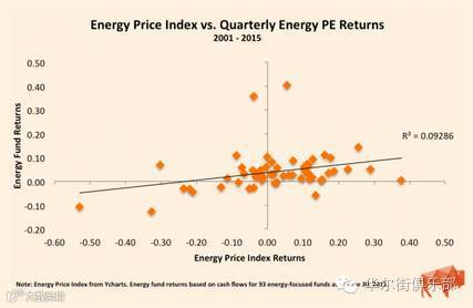 而在探究能源价格和私募股权收益关系的散点图中,散点分离程度过高,相关性系数仅为0.09286,表明能源价格与PE估值几乎不存在太大关联。
