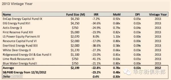 2013年数据显示,私募股权的MoM均值为0.78X,其中未得到的预期回报为投资回报的0.76X,达已分配回报的34倍以上。而标普指数显示,当年上市能源公司MoM仅为0.48X,仍劣于私募市场表现。