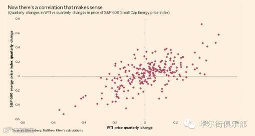 Bison最近做了一个能源价格与能源企业估值相关性的研究。在纵轴为WTI原油价格、横轴为标普上市能源公司的散点图中,散点相对集中,几乎能形成回归性曲线,表明能源价格与上市公司相关性较强。这也与我们平常的观察一致,油价上涨,利好能源公司股价。