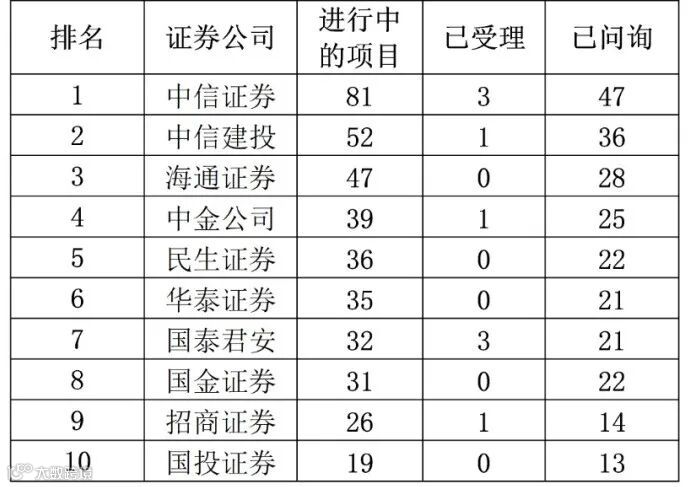 券商IPO项目的储备数量代表着券商的后劲。头部券商“三中一华一海”排名居前。