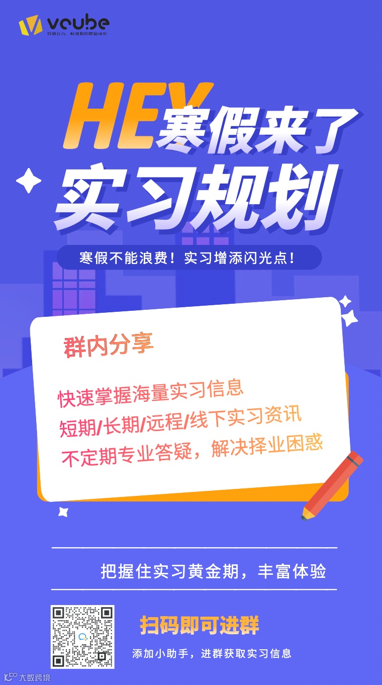 寒假实习的优势可真实太多了:申请难度低、实习时间短,能更快为简历镀金,优秀的同学还可以转正。可远程、超短期、可转正、零基础 、留学生专属等等,你需要的寒假实习,这里都有!