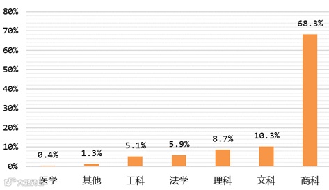 分析参与本次调查的应届生的专业背景,商科以68.3%的比例独占鳌头,文科占比10.3%,理科占比8.7%,法学占比5.9%,工科占比5.1%,医学占比0.4%,如图1.4所示。与2015年的调查数据相比,商科专业占比由62.6%增长为68.3%,增加了5.7%。文科专业占比由16.53%降至10.3%,而其他专业变动不大。