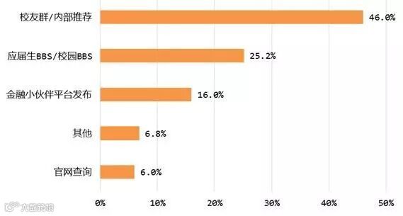 求职信息来源上,校友群/内部推荐占比46.0%,应届生BBS/校园BBS占比25.2%,金融小伙伴平台发布占比16.0%,官网查询占比6.0%。