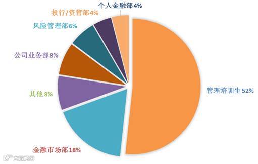 超过一半的被调查者的就业部门是管理培训生(包括了柜员、轮岗、客户经理。除了总行分行投资银行部、资产管理部、金融市场部等少数的利润中心部门可以跳过柜台阶段直接进入选定的业务部门做业务,大多数银行就业的毕业生首先要面对的就是柜台工作,哪怕是一些学历和学校背景比较优秀的毕业生。对银行而言,柜台人员的流动性很大,每年都需要招聘新人来补上空缺的柜台岗位;而核心的利润部门,一是因为空缺的岗位有限,二是因为可以通过社会招聘、有经验的员工内部竞聘的方式填补空缺,所以从应届毕业生中选拔的机会较少。
