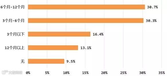在实习持续时间上,实习3个月以下占比16.4%,实习3个月-6个月占比30.3%,实习6个月-12个月占比30.7%。