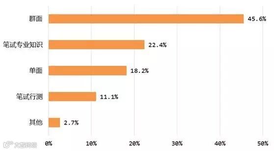 在求职最难的环节上,参与本次调查的应届生选择群面的占比45.6%,选择笔试专业知识的占比22.4%,选择单面的占比18.2%,选择笔试行测的占比11.1%。