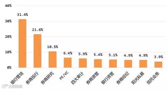 在参与本次调查的应届生就业偏好上,商业银行管理培训生以31.4%的比例位居榜首,其次是证券公司投行部占比21.6%。证券公司研究部、PE/VC、四大审计、券商资管等紧随其后。