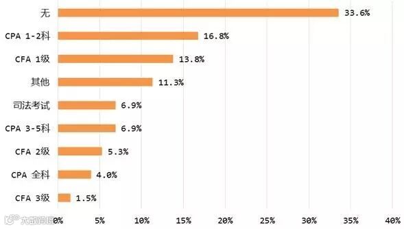 在相关证书上,CPA通过1-2科占比16.8%,通过3-5科占比6.9%,通过全科占比4.0%;CFA获得1级占比13.8%,获得2级占比5.3%,获得3级占比1.5%;通过司法考试的占比6.9%。