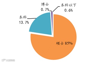 参与本次调查的应届生的学历情况如图1-2所示,硕士占比85.0%为最大比例选项,本科占比13.7%,博士占比0.7%,本科以下为0.6%。相比于2015年的调查结果,硕士占比由2015年的77%增长为85%,比去年增加8个百分点,而本科学历占比由21.41%下降为13.7%。