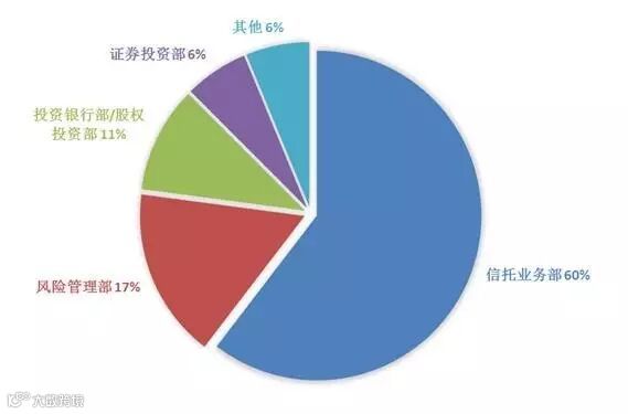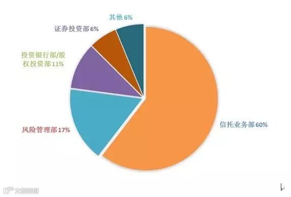 在参与本次调查的签约信托公司的应届生中,业务部门占比60%,风险管理部占比17%,投资银行部/股权投资部占比11%,证券投资部占比6%。以往应届生去信托公司主要集中在业务部门,投资部门随着股权投资市场的火热也逐渐成为应届生的考虑对象。和去年的调查结果相比,证券投资部的占比从13%下降到了6%,信托业务部的占比从50%上升到了60%。这也从一个侧面反应出了股市行情的好坏直接影响到了信托公司证券业务从业人员比例。