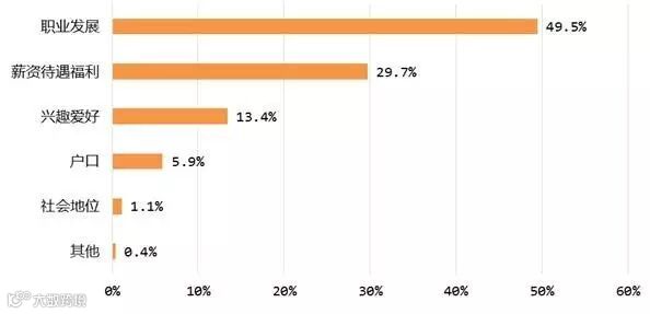 在职业选择最看重的因素上,选择职业发展的占比49.5%,选择薪资待遇福利的占比29.7%,选择兴趣爱好的占比13.4%,选择户口的占比5.9%,选择社会地位的占比1.1%。