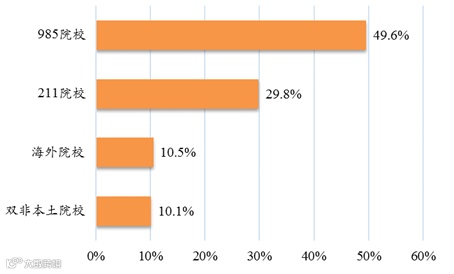 参与本次调查的求职者的毕业院校分布结果如图1-3所示,其中985院校占比49.6%,将近五成;211院校占比29.8%,将近三成;因为在选项设计上是单选题,所以985和211院校的总和高达八成。双非本土院校占比10.1%,海外院校占比10.5%,院校分布结果与2015年的调查结果相比变动不大。