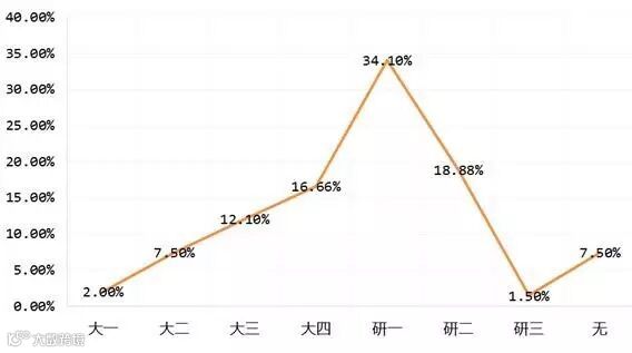 实习开始高峰为研究生一年级,高达34.1%。研一和研二加起来其将近53%。结合近几年金融行业岗位普遍的学历门槛已提高至研究生的趋势来看,绝大多数选择读研深造的应届生都在获得读研资格之后,就尽早开始了自己未来就业的准备。