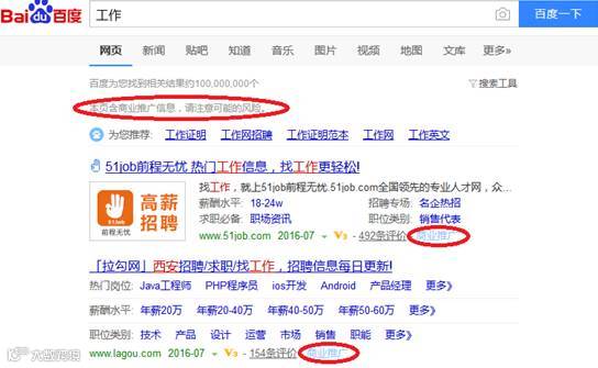3.减少每页面搜索结果中商业推广信息比例。(小编搜索关键词“工作”,搜索结果14条,商业推广信息4条,占比近30%。)
