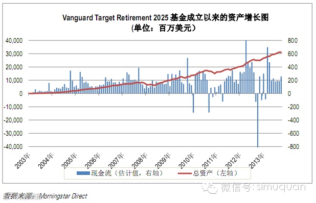 在FOF基金类型中,目标日期基金(Target Date Fund,也称生命周期基金Lifecycle Fund)作为最重要的类别,对FOF过去十几年资产的增长贡献巨大。根据晨星的一项研究,从1999年至2013年,目标日期基金的总资产从不足100亿美元增长至6000亿美元左右,增长近百倍。