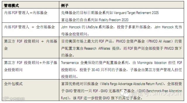 关于FOF是采用内部管理人还是引入第三方管理人一直是业内讨论的一个焦点问题,通过分析美国市场上的主要FOF管理人,我们可以总结出以下几种模式: