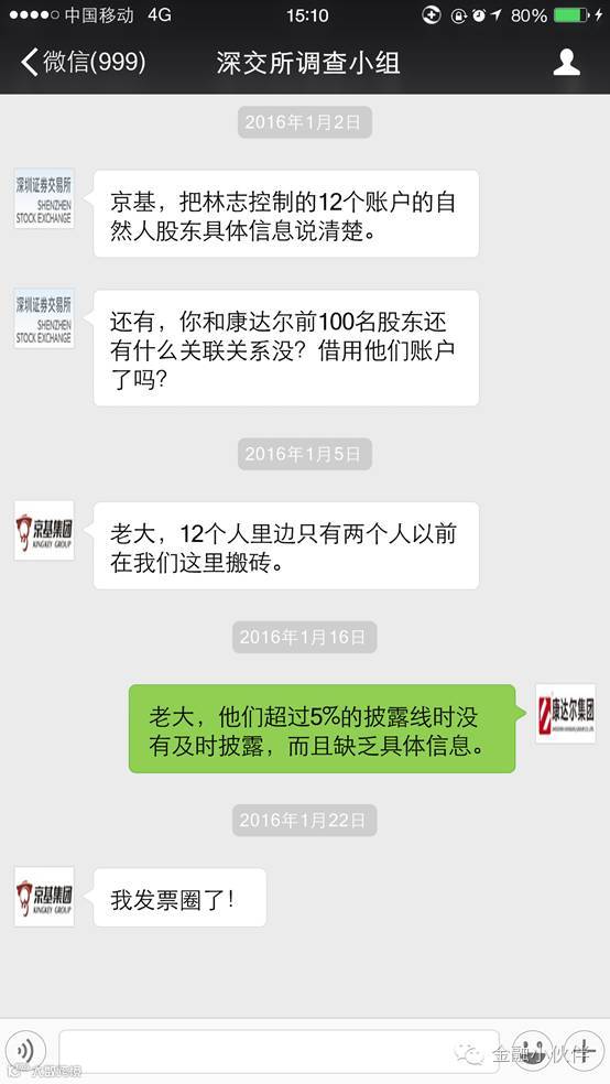 2016年6月7日,康达尔放了大招,深交所对京基集团进行了问询,称其收到了康达尔的证明材料,林志及其控制的12个账户的自然人在2003年至2015年9月期间,曾在京基集团任职,要求京基集团做出说明。