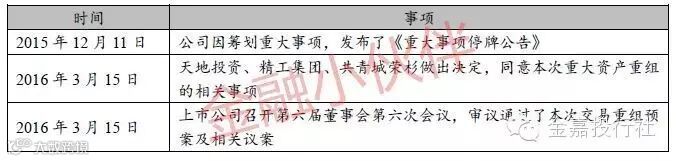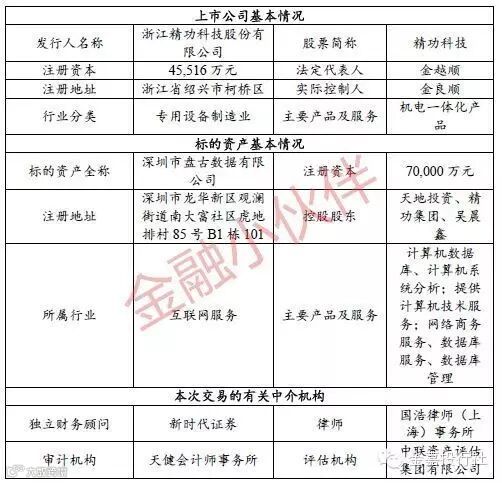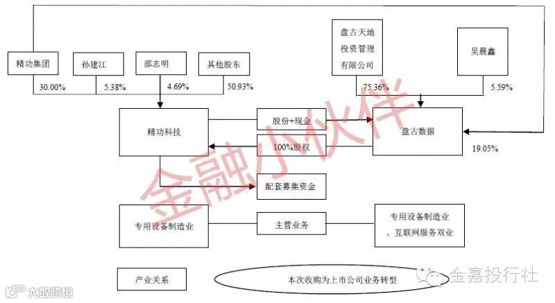 上市公司控股股东精功集团于2016年3月11日受让天地投资持有的盘古数据19.05%股权,精功集团入股盘古数据为本次交易做下铺垫。此后不久,上市公司便于2016年3月15日董事会审议通过了本次交易预案,精功科技以52亿元交易作价收购盘古数据,精功集团获得98,039,117股上市公司股票作为交易对价。