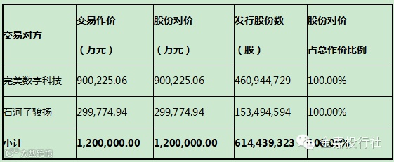完美环球娱乐股份有限公司(以下简称“完美环球”)拟向完美数字科技、石河子骏扬发行股份购买其持有的完美世界(北京)数字科技有限公司(以下简称“完美世界”)100%的股权;同时,完美环球拟采用定价发行的方式向池宇峰、员工持股计划(认购配套融资方式)(一)、员工持股计划(认购配套融资方式)(二)、招商财富-招商银行-完美1号专项资管计划非公开发行股票募集配套资金,用于影视剧投资、游戏的研发运营与代理等项目,募集金额不超过500,000万元。参考中企华出具的评估结果,经交易各方协商确定本次交易中完美世界100%股权的交易对价为1,200,000万元。