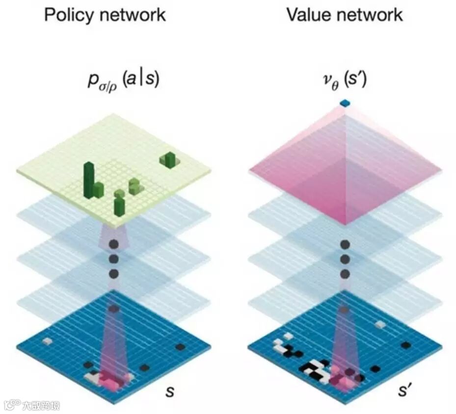 在深度卷积神经网络下, AlphaGo是通过两个不同神经网络“大脑”合作来改进下棋。