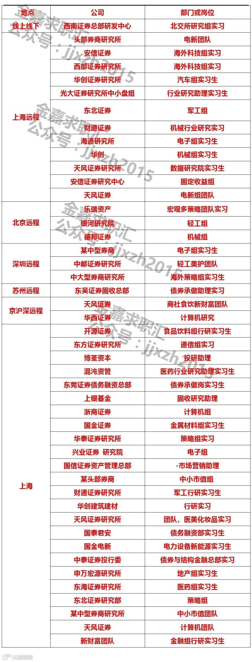 【岗位要求】 1、211及以上硕士研究生,金融、经济相关专业优先; 2、有证券行研相关实习经验者优先; 3、连续实习至少3个月(须保证实习时间),尽快开始工作; 4、踏实靠谱,逻辑思维能力强,具备优秀的写作能力、沟通协调能力和团队合作意识,有较强执行力,需要具备一定抗压能力以及消息任务及时响应。