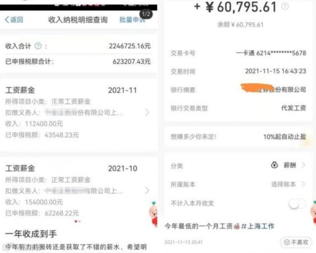 2022年初,也曾有一位证券公司分析师因“晒224万工资单”火遍网络。网络截图显示,该分析师全年缴纳的税额就超过了62万元,全年收入最低的一个月工资也有6万多。