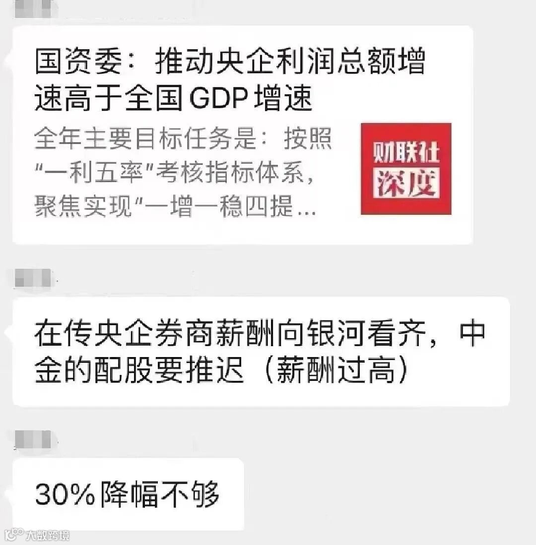 2月24日再有券商首席在微信群里发言降薪的截图流出,根据截图,该海外首席先发了一篇央企利润增速超过全国GDP增速的文章,随后便表示,“在传央企券商薪酬向银河看齐……”