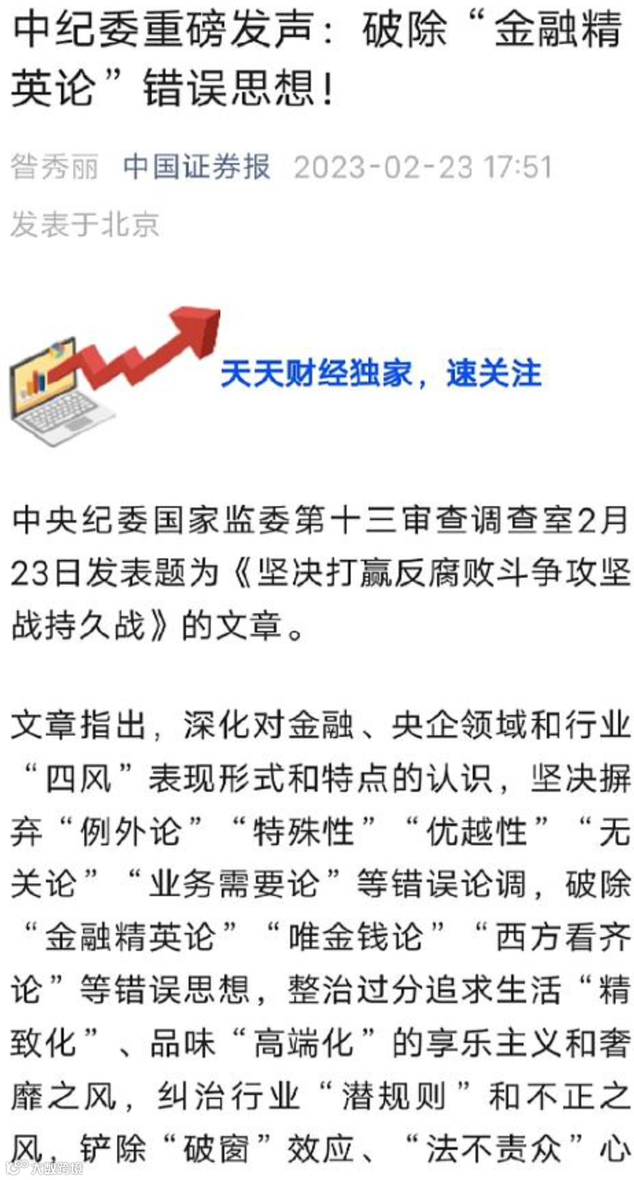 在2月23日,中纪委发声:“破除‘金融精英论’‘唯金钱论’‘西方看齐论’等错误思想,整治过分追求生活‘精致化’、品味‘高端化’的享乐主义和奢靡之风,不断加固金融和央企领域落实中央八项规定精神的堤坝”。
