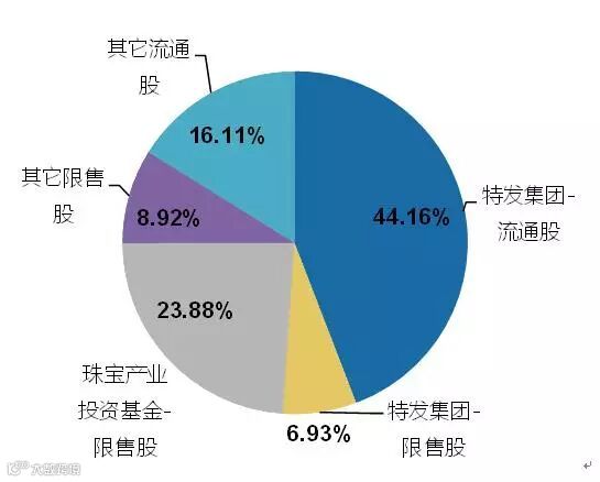 公司是一家地方国有企业,实际控制人为深圳市国有资产监督管理局,第一大股东为深圳市特发集团有限公司,持股比例为51.09%。公司今年3月经历了一次定向增发,非公开发行了7700万股,募集资金6.3亿,其中深圳远致富海珠宝产业投资基金投资了超过90%。在公司目前的股本结构中,2.97亿股本中只有1.79亿流通股,而流通股中第一大股东又持有了1.31亿股,也就是说公司实际的流通股本只有不到5000万股,这也是公司被游资选中疯狂炒作的一个重要原因。