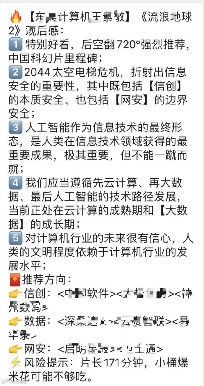 1月27日,招商证券策略首席分析师张夏在朋友圈发表了一则《流浪地球2》观后感,从卖方研究视角剖析这部科幻片中潜在的投资机会。