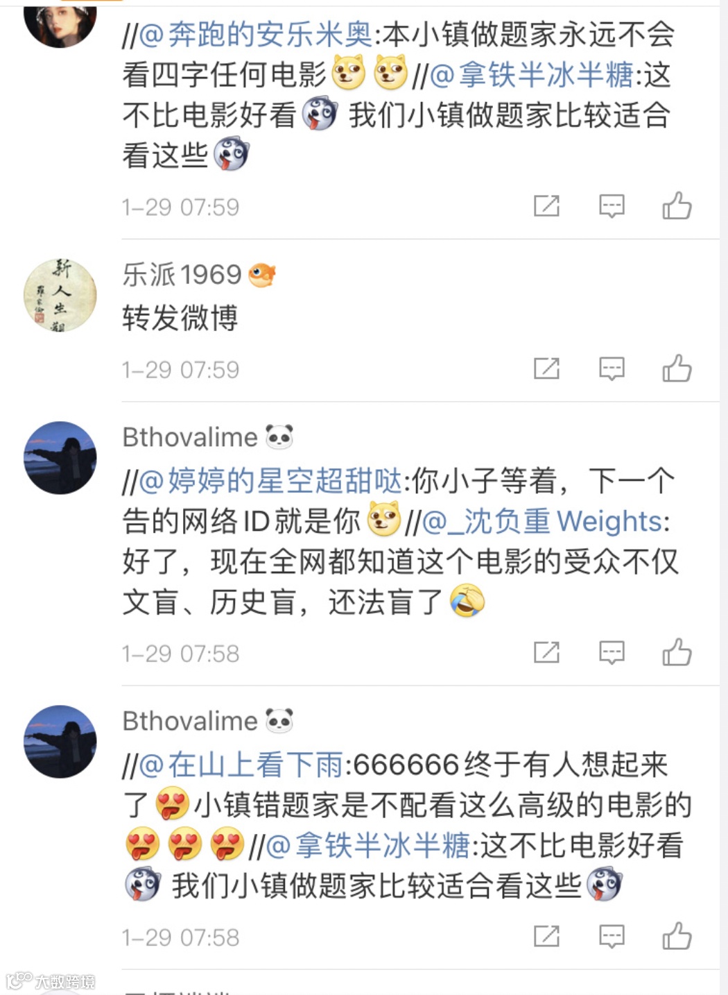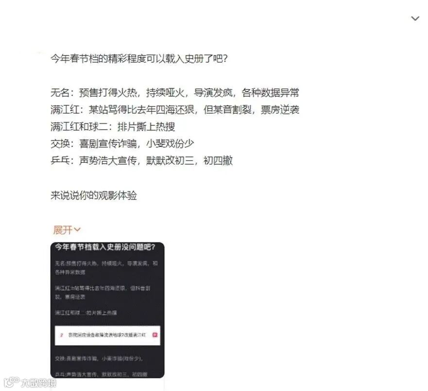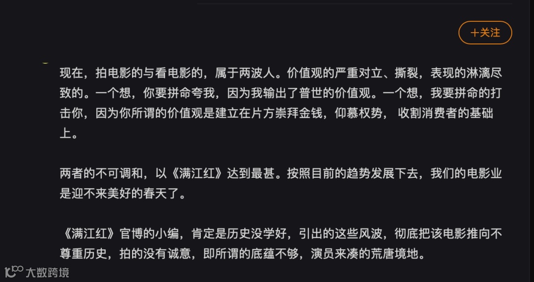 但是各大平台都是电影《满江红》的好评文章,有人说是有包括大V账号在内的专业人士帮忙背书,以及不少下场控评。