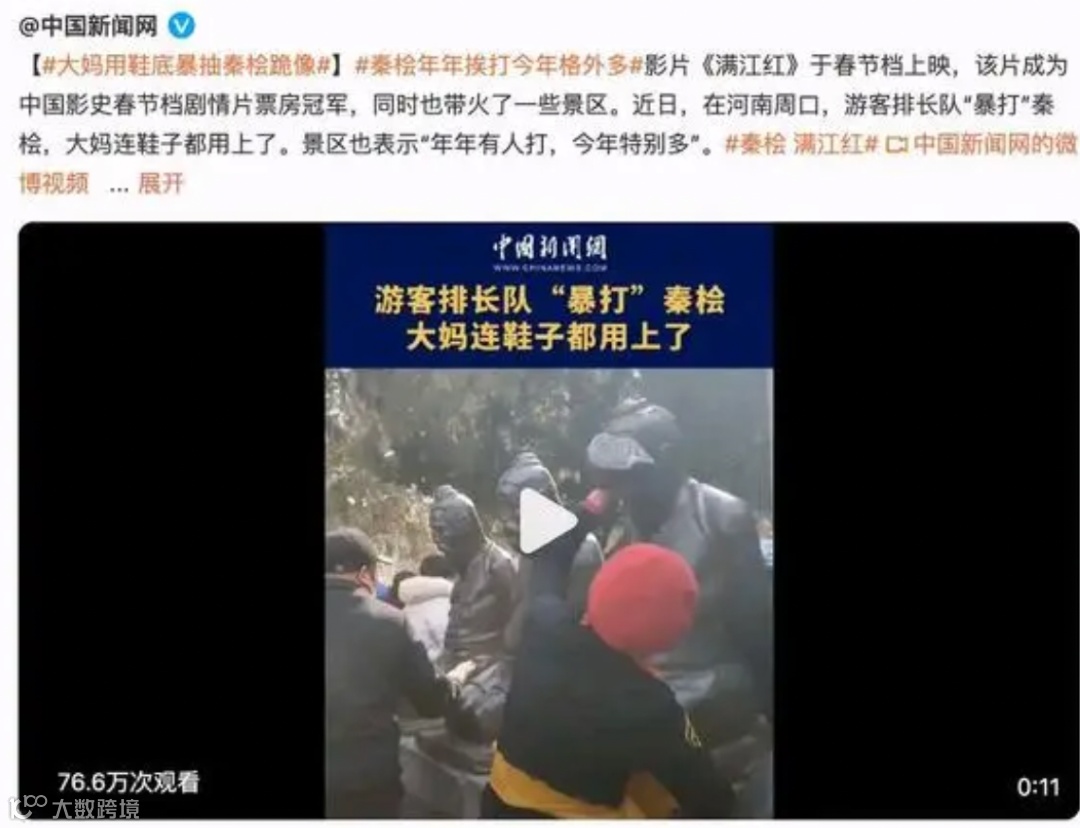 1月27日,一则视频显示河南周口淮阳区太昊伏羲陵景区游客排起了长队,在岳武忠祠打秦桧跪像,甚至有人用鞋抽打。