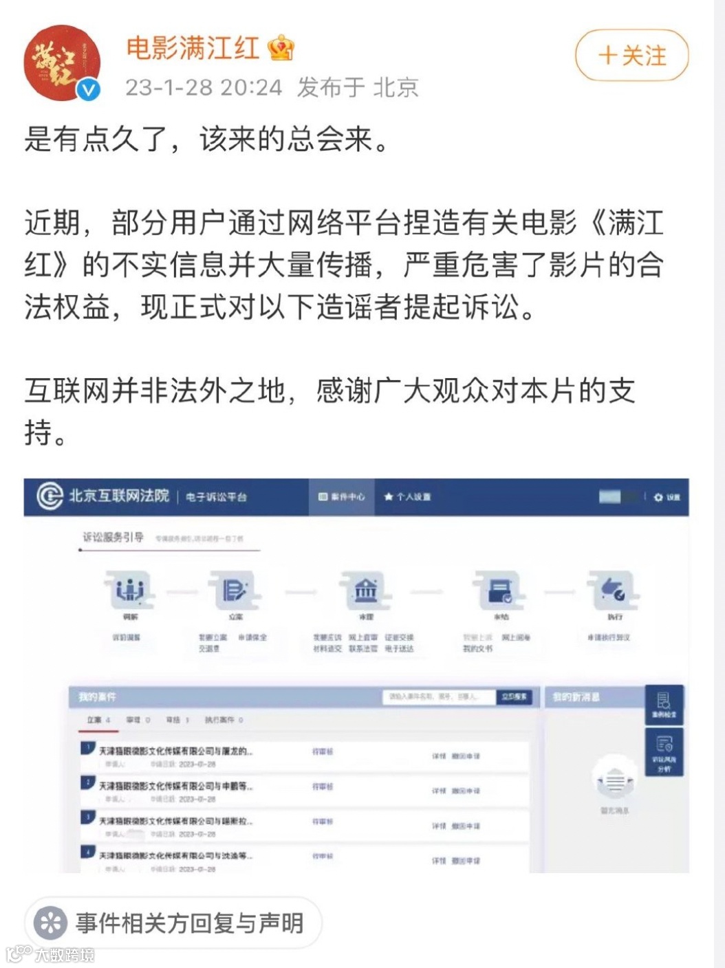 互联网并非法外之地,感谢广大观众对本片的支持。《满江红》官方微博发布的图片显示,其已在北京互联网法院提起4起诉讼。