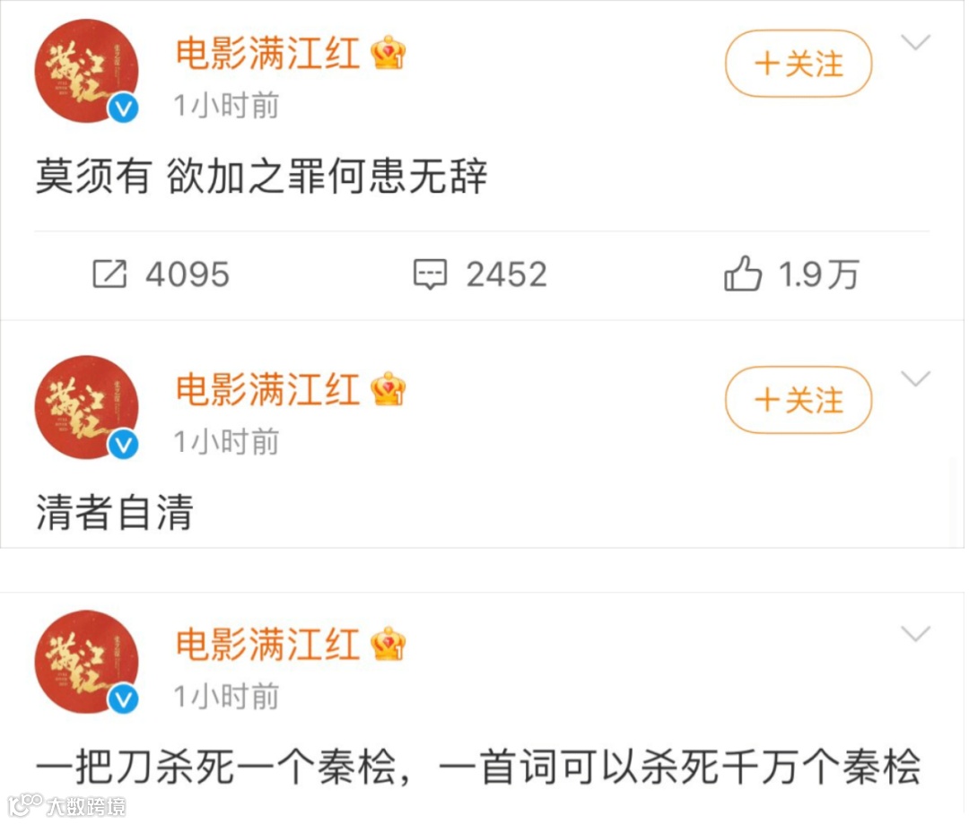 1月28日,《满江红》官方微博连发数条微博,回应争议,表示"莫须有,欲加之罪何患无辞";转发科普《满江红》没有偷票房的文章,表示“清者自清";