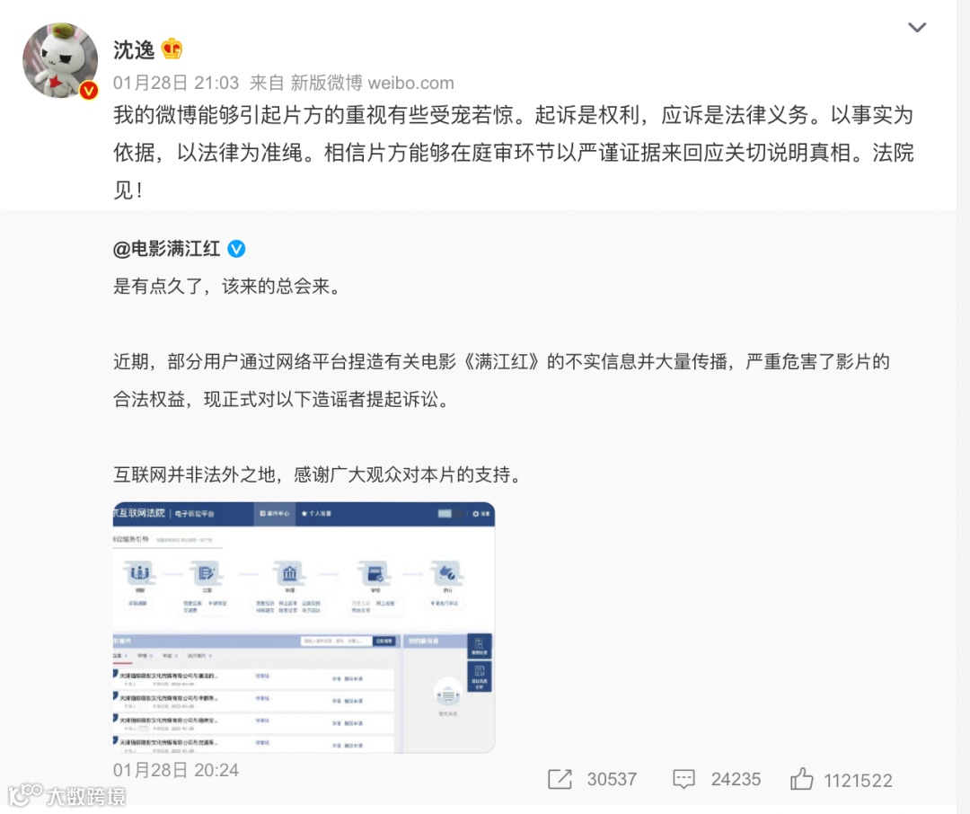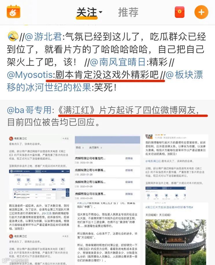 随后,《满江红》官方微博发文称,近期,部分用户通过网络平台捏造有关电影《满江红》的不实信息并大量传播,严重危害了影片的合法权益,现正式对以下造谣者提起诉讼。