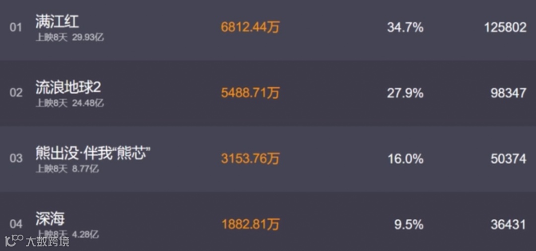 在开始的时候《满江红》《流浪地球2》两部作品齐头并进,占据票房榜前两名,而《流浪地球2》一直略微领先。