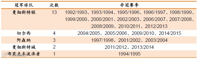 截止2015年,英超联赛共举办了23届联赛,其中曼联13次夺冠,切尔西4次夺冠,阿森纳3次夺冠,曼城2次夺冠,布莱克本1次夺冠。由1995/1996赛季开始参赛球队由22队减至20队,每支球队共进行38场赛事。每场胜方可得3分,平局各得1分,负方得0分,总积分最高的队伍可以夺得联赛冠军。