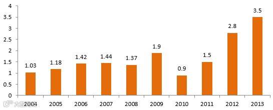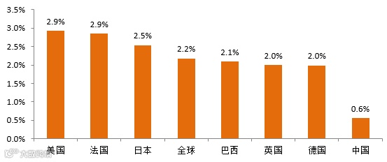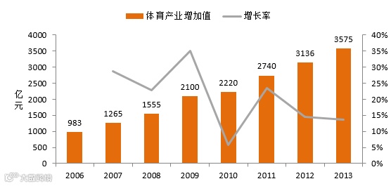 2013年中国体育及相关产业增加值3575亿元,但对应的人均体育消费仅27美元,仅占全球平均水平(每年217美元)的12.44%。此外,全球体育产值为7.5万亿元,占GDP比重约为2.5%。其中美国体育产业产值高达3万亿元,占GDP比重为3%。我国体育产业产值仅3500亿元,占GDP比重仅0.6%,存在极为可观的提升空间。