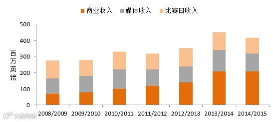 曼联俱乐部的收入主要来自于三个方面:比赛日收入(包括门票和食品等的销售)、媒体收入(主要是转播权收入,包括国内联赛、国内杯赛和欧洲赛事转播权分成)、商业收入(主要是商业赞助和广告,包括收入、商品销售收入和其他商业经营收入等)。对于最大的商业赞助收入的来源角度看,曼联采取了多元化的经营模式,包括赞助、零售、新媒体等,这些赞助随着曼联整体知名度的提升不断的上升。2014/2015赛季商业收入为1.97亿英镑,占公司总收入的比重提升至49.85%。