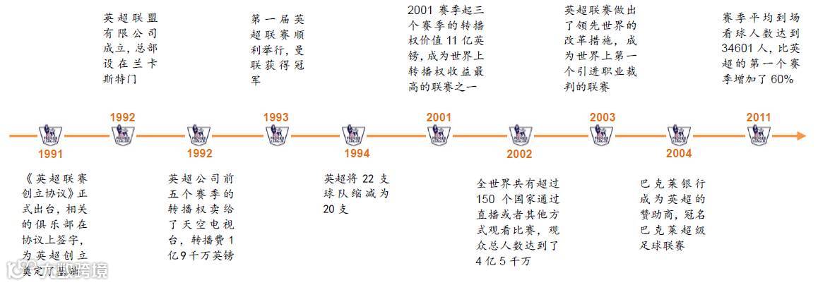 英国是现代足球的发源地,每年与足球产业相关的商业活动的资产总值已经超过100亿英镑。英超联赛是英格兰职业足球体系中最高等级联赛,也是世界最具商业价值的足球联赛。1992年英国足球联赛甲组俱乐部组建英超联盟有限公司,英超联赛正式成立。英超成立之初共有22支球队,在1994/1995赛季,英超将原来的22只球队减少为20只,形成了现在的规模。2004年,巴克莱银行成为英超的赞助商,冠名为巴克莱超级联赛。