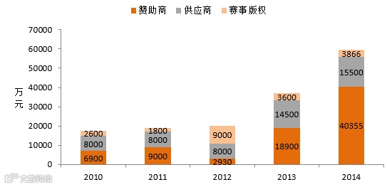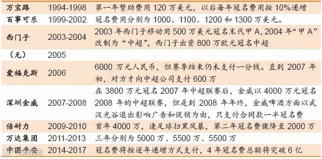 冠名赞助商收入是目前中超联赛的主要收入来源。2014年,中超公司在冠名企业的选择上遵循了市场化的操作方式,除了价格因素以外,对竞标企业的品牌声誉、市场影响、财务实力也进行了综合考量,最后中国平安获得2014至2017年中超联赛独家冠名权。从历年的比赛赞助来看,2012年广告赞助达到高峰,为12.67亿元。