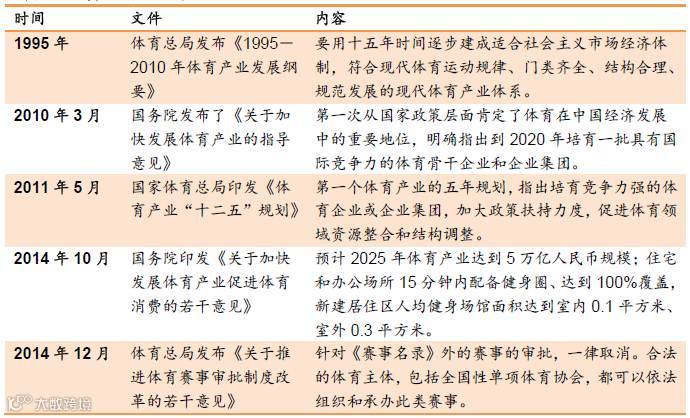 近年来,为支持体育产业的发展,顶层设计政策陆续出台。2014年10月20日,国务院发文《国务院关于加快发展体育产业促进体育消费的若干意见》(46号文),明确提出将推动体育产业成为经济转型升级的重要力量和国民经济的重要支柱型行业,指出到2025年体育产业总规模超过5万亿元。
